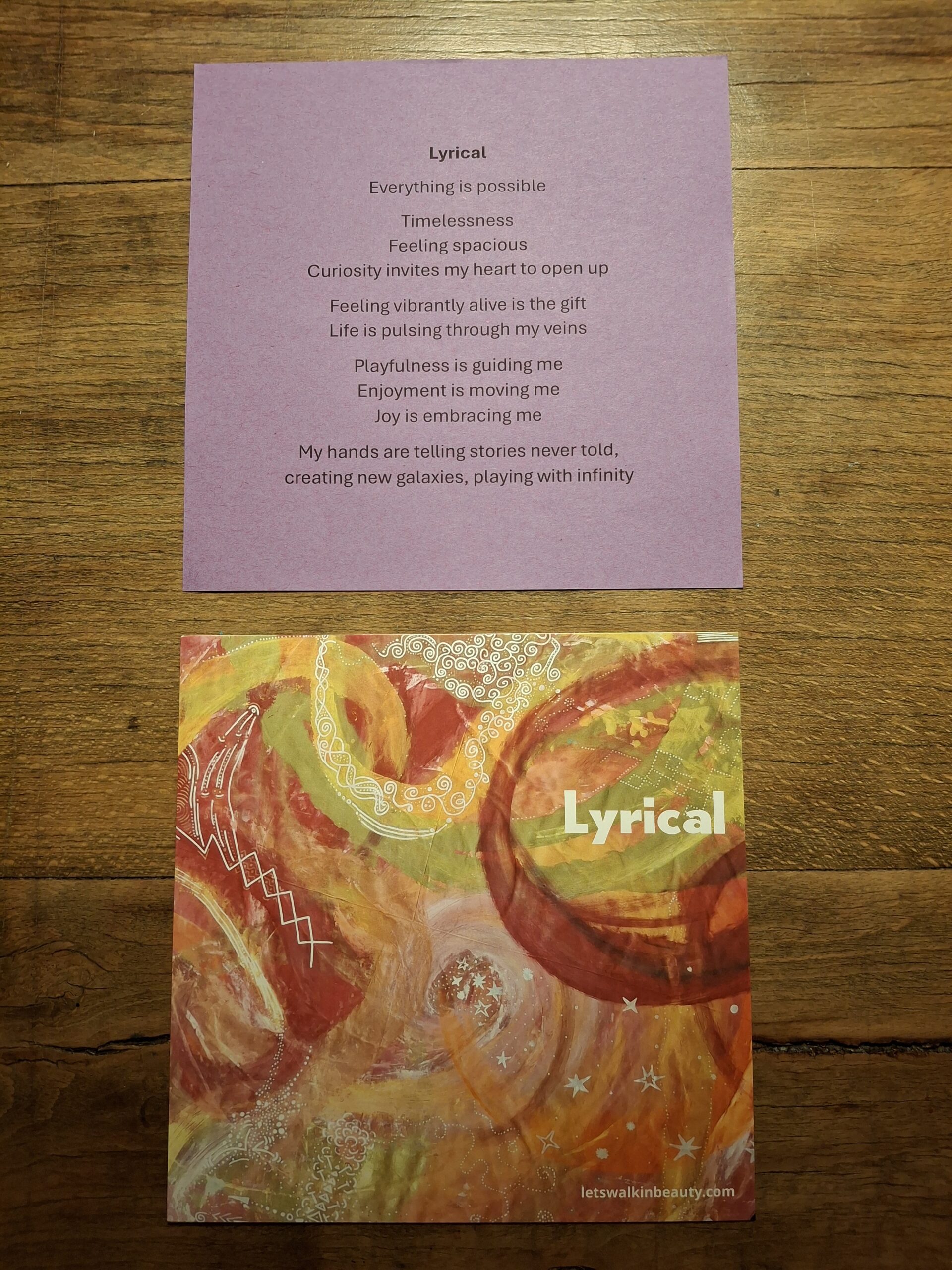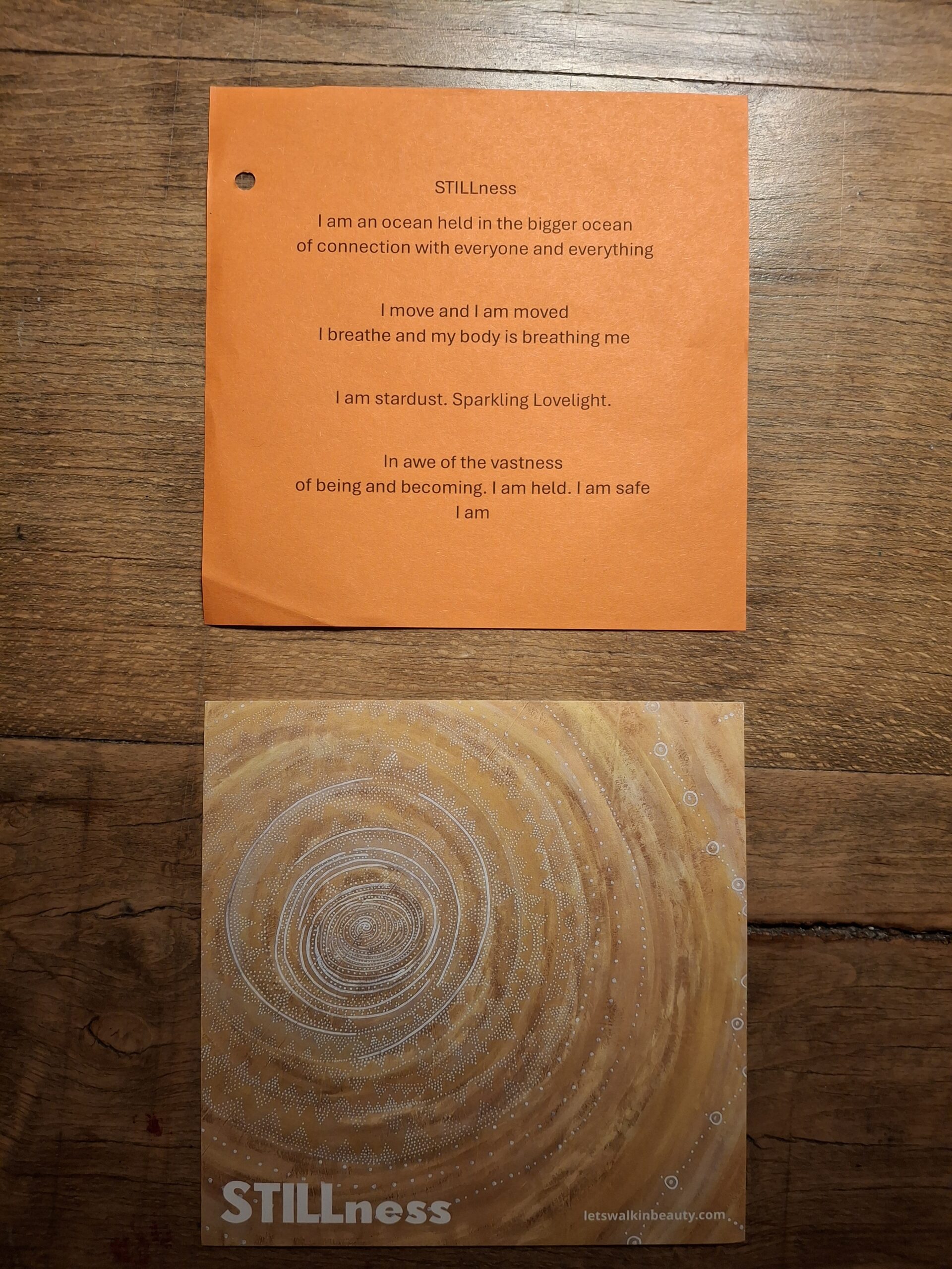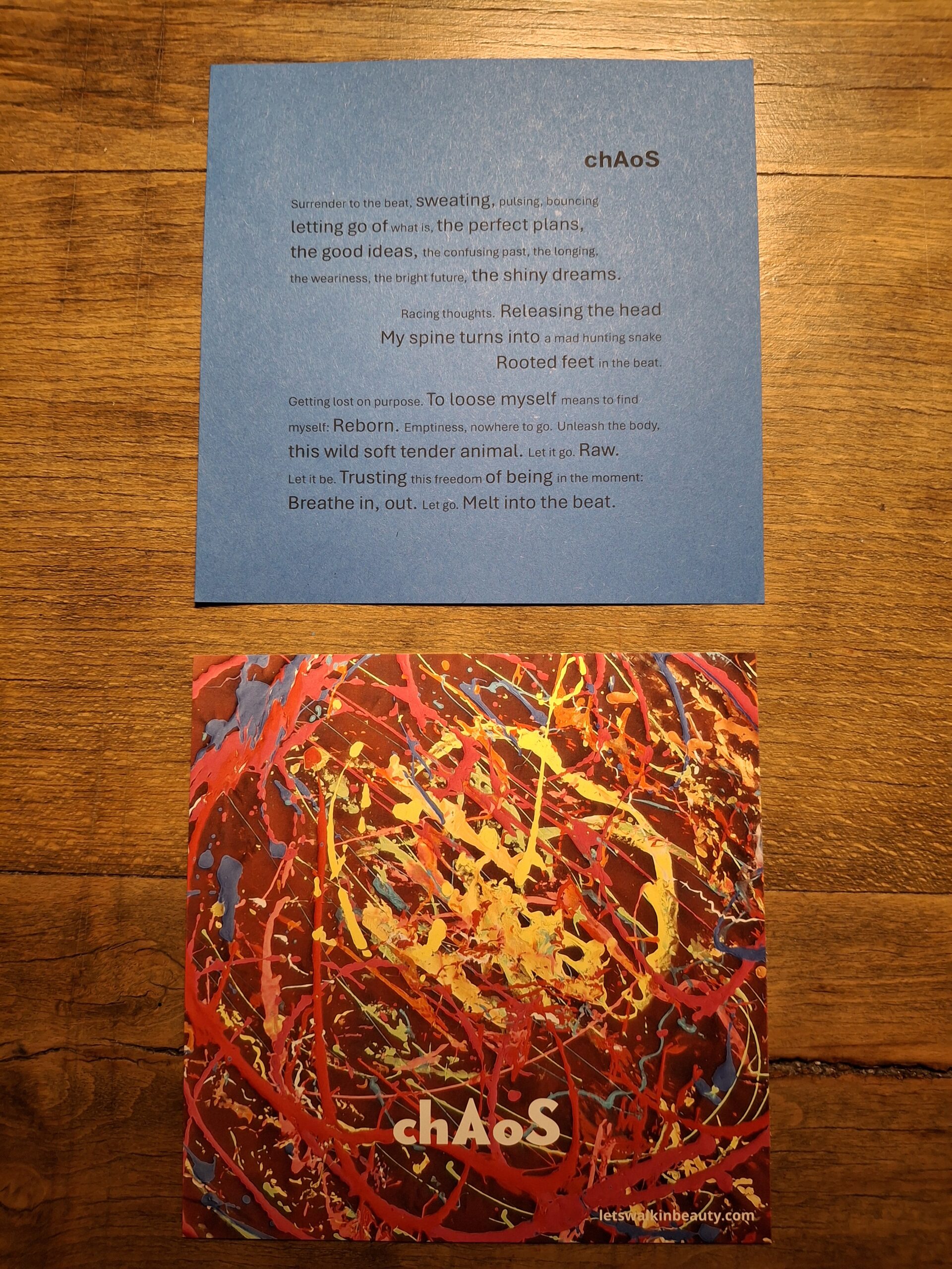 5 Karten mit farbigen Hochglanzdruck: Bildausschnitte von den allen „Dots“ (Runde Bilder): Flowing, Staccato, Chaos, Lyrical, Stillness